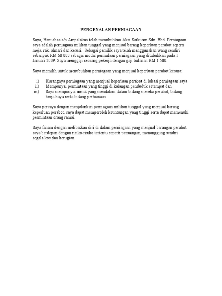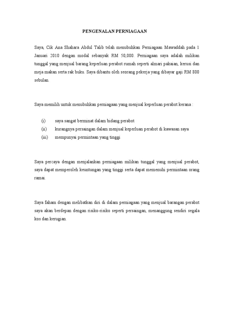 Perniagaan semasa COVID-19 Kami sedia membantu. Contoh Pengenalan Dan Profile Perniagaan A PENGENALAN PERNIAGAAN Saya telah menubuhkan perniagaan Perniagaan Perabot Syeffuzeq yang menjual pelbagai jenis perabot di Taman. Check more flip ebooks related to 11 PENGENALAN KEPADA PERNIAGAAN FLIP BOOK PDF of azmatunsemaun.