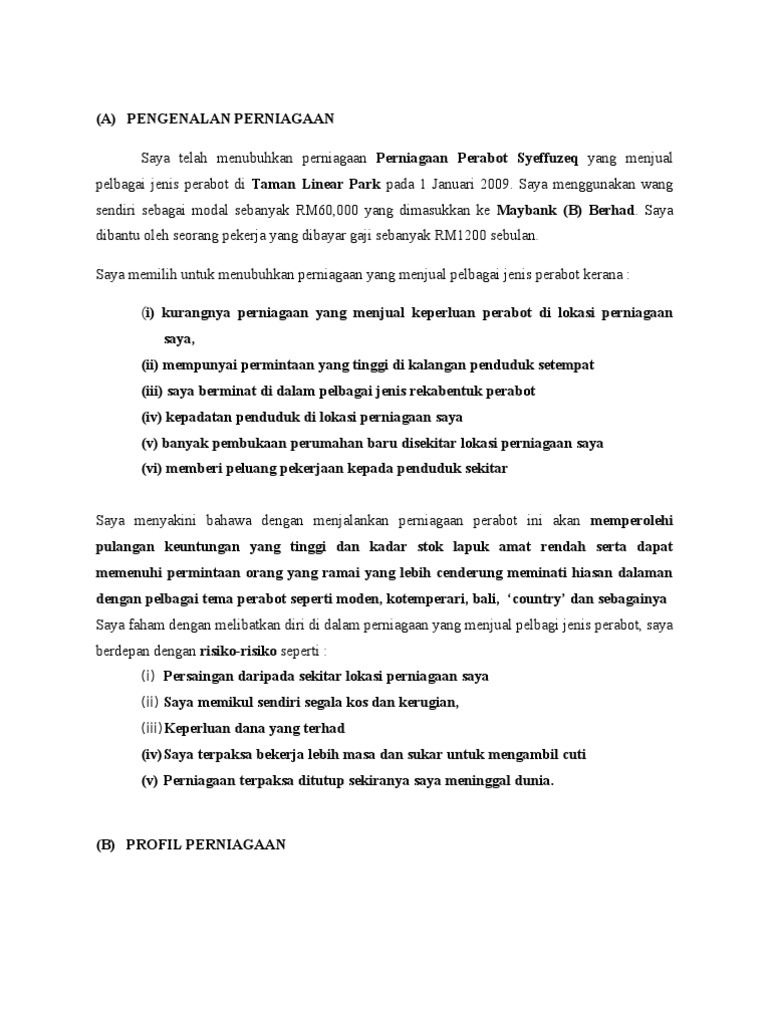 Saya ___ telah menjalankan perniagaan menjual pakaian seragam di bandar Keningau sejak 1 April 2008. ZM ENTERPRISE 10 Pengenalan Perniagaan Kumpulan kami telah bercadang untuk menjalankan perniagaan menjual sarung dan bantal kusyen yang bercorak batik. Takpe sis terangkan satu2 point yang ada dalam format itu.